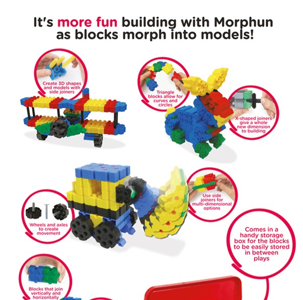 The DOUBLE GOLD award winning Morphun Junior sets for ages 4+, have the unique side-joining feature built into both square and triangular bricks. Sets include long connecting pieces and direction changers as well as wheels and axles. Morphun Junior sets already make far more models and shapes than competitor sets but with far fewer pieces. All Morphun square bricks are compatible with traditional plastic bricks.